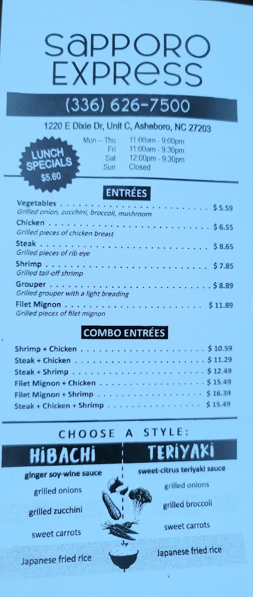 The menu at Sapporo Express offers a straightforward and satisfying selection of Japanese and Asian-inspired dishes, centered around hibachi-style entrees and classic lunch specials. It’s the kind of menu that feels approachable for a casual meal, whether you’re stopping by for a weekday lunch or a relaxed dinner with friends and family.